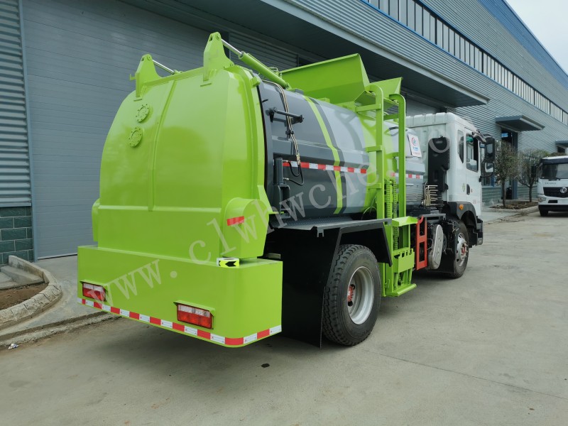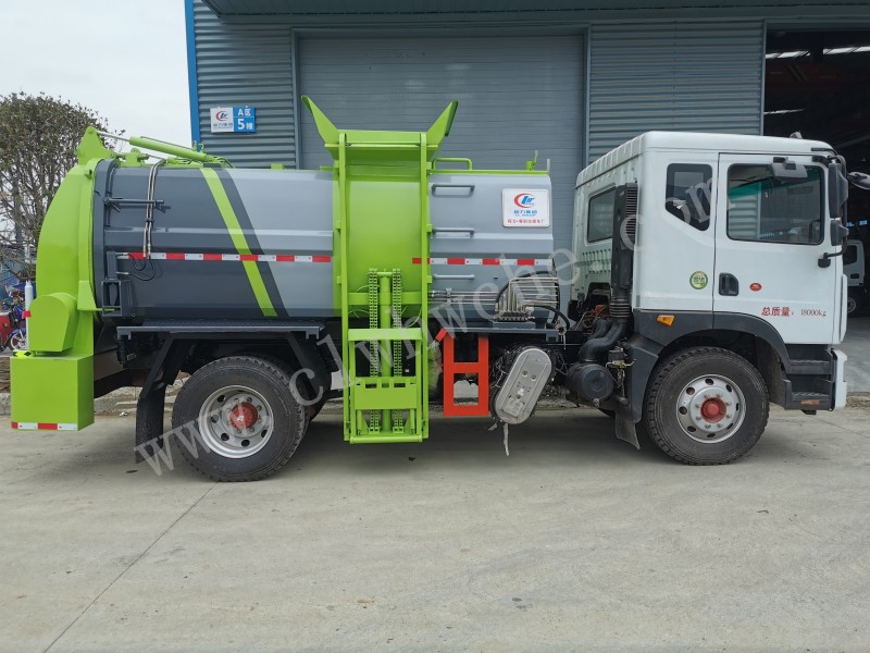 罐體采用4-5mm優質碳鋼制作,方形罐體,罐體前后封頭采用圓弧蝶形封頭,配拉桿式提升機,可掛120/240升垃圾桶,罐體底部配雙缸液壓舉升自卸,罐體尾門液壓打開和鎖緊+手動鎖緊裝置,罐內設固液分離裝置,罐尾設液體自流閥,液位窗,后門液壓開啟,帶工具箱,洗手裝置。