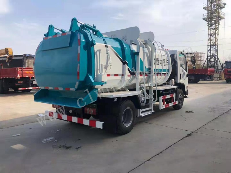 罐體采用4-5mm優(yōu)質(zhì)碳鋼制作,方形罐體,罐體前后封頭采用圓弧蝶形封頭,配拉桿式提升機,可掛120/240升垃圾桶,罐體底部配雙缸液壓舉升自卸,罐體尾門液壓打開和鎖緊+手動鎖緊裝置,罐內(nèi)設固液分離裝置,罐尾設液體自流閥,液位窗,后門液壓開啟,帶工具箱,洗手裝置。