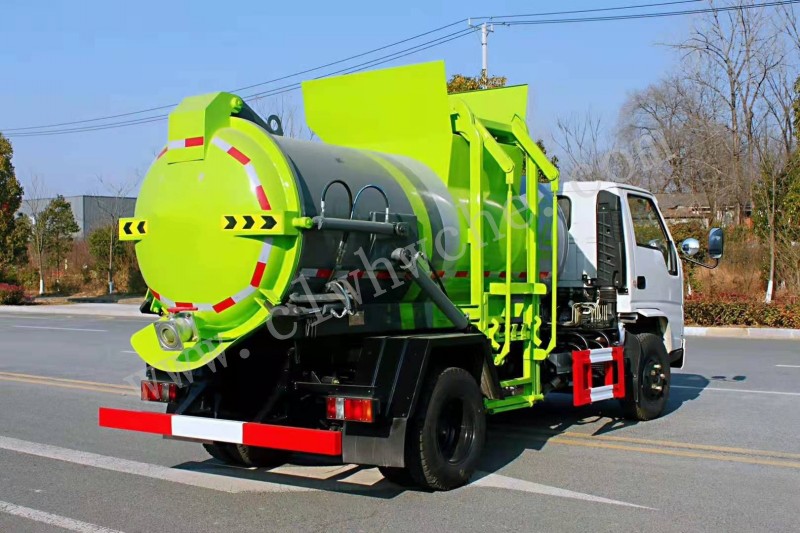 罐體采用4-5mm優質碳鋼制作,圓罐罐體,罐體前后封頭采用圓弧蝶形封頭,配拉桿式提升機,可掛120/240升垃圾桶,罐體底部配雙缸液壓舉升自卸,罐體尾門液壓打開和鎖緊+手動鎖緊裝置,罐尾設液體自流閥,液位窗,后門液壓開啟,帶工具箱。