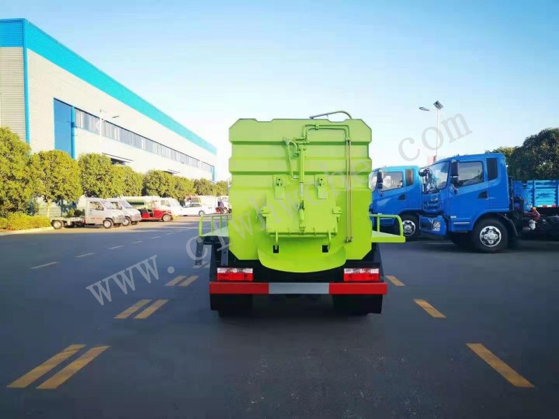 罐體采用4-5mm優質碳鋼制作,方形罐體,罐體前后封頭采用圓弧蝶形封頭,配拉桿式提升機,可掛120/240升垃圾桶,罐體底部配雙缸液壓舉升自卸,罐體尾門液壓打開和鎖緊+手動鎖緊裝置,罐尾設液體自流閥,液位窗,后門液壓開啟,帶工具箱。