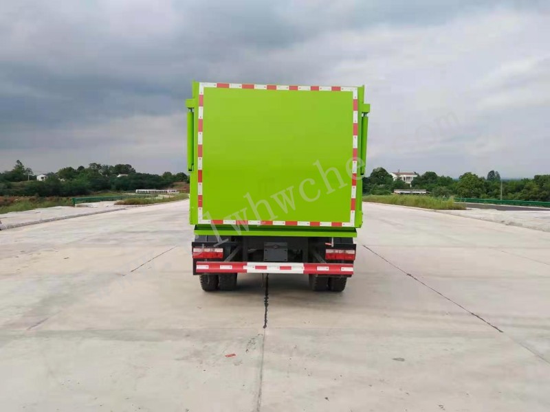箱體采用4mm碳鋼板制作,箱體前部側面帶有掛桶提升機構,可自動舉升垃圾桶倒入垃圾,帶自卸功能,帶掛桶提升機翻蓋尾部裝有橡膠密封條,防污水滴漏,掛桶垃圾車可根據客戶要求搭配120升或240升塑料桶。