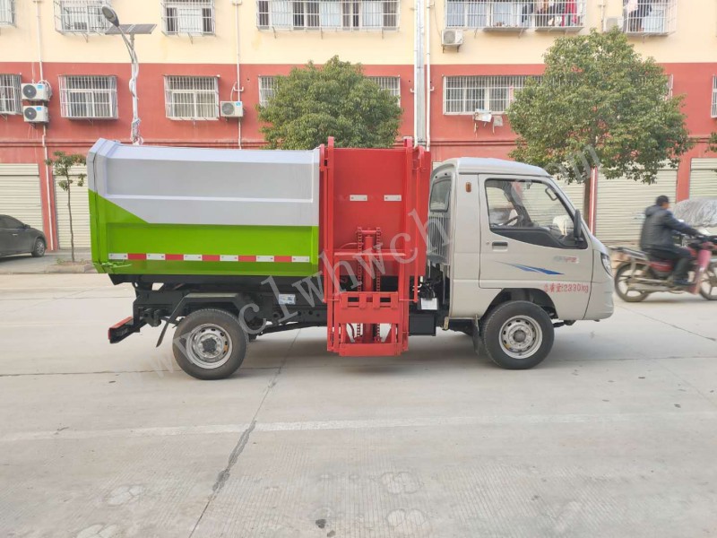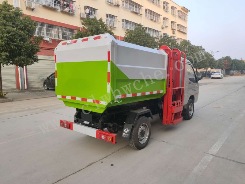 箱體采用3-4mm碳鋼板制作,箱體前部側(cè)面帶有掛桶提升機構(gòu),可自動舉升垃圾桶倒入垃圾,帶自卸功能,帶掛桶提升機翻蓋尾部裝有橡膠密封條,防污水滴漏,掛桶垃圾車可根據(jù)客戶要求搭配120升或240升塑料桶。