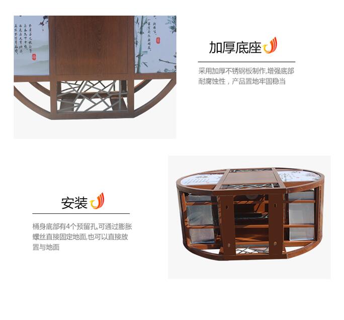 ③:整體表面處理采用熱轉印烤木紋工藝,并印有“梅蘭竹菊”四君子戶外專用圖案,色彩鮮明,壽命長,無毒無味,附著力強等特點。