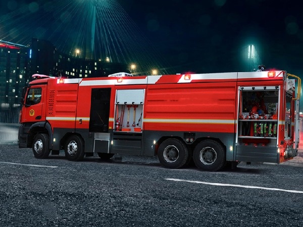 該泡沫消防車,整車主要由梅賽德斯-奔馳 Arocs 4158型消防車專用底盤、**乘員室、水罐、泵室、泵送系統、智能集成**系統、水**、水炮、隨車消防器材以及其他附屬**等組成。整車改裝后載荷分配均勻,質心位置和穩定性計算**,內部空間布局合理,能充分滿足操作人員的使用要求。